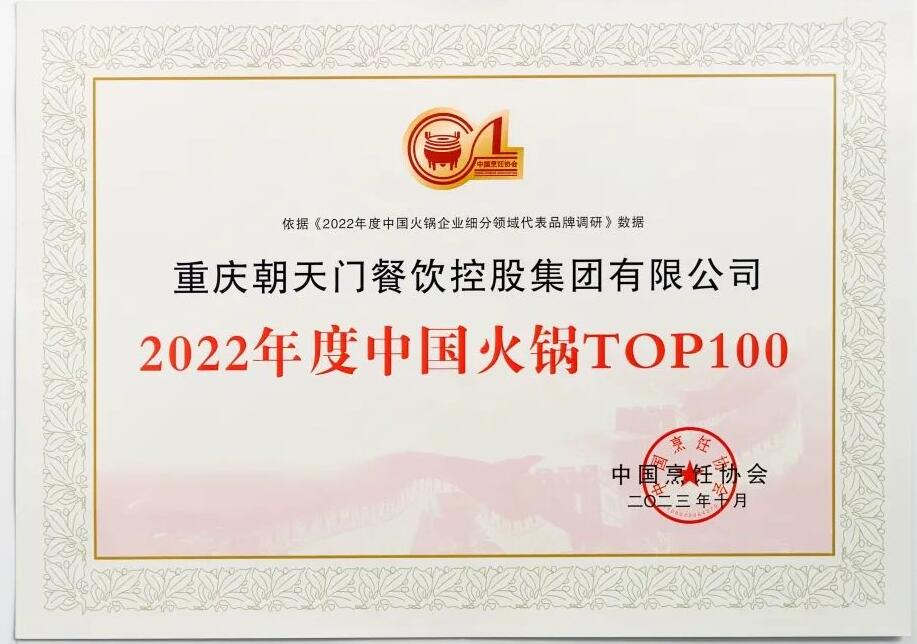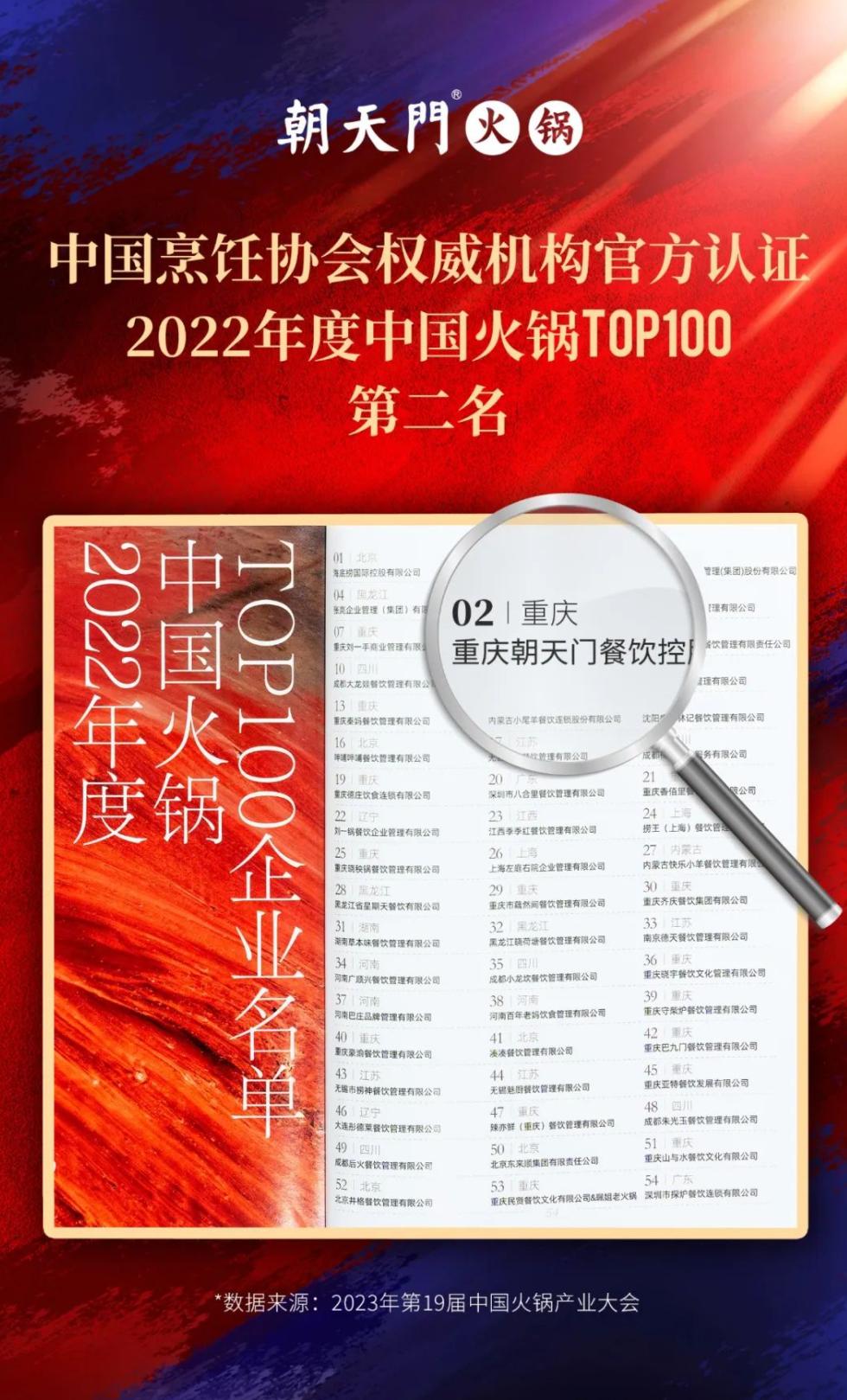 會(huì)上,由中烹?yún)f(xié)等權(quán)威機(jī)構(gòu)認(rèn)證的《中國(guó)火鍋Top100企業(yè)名單》重磅發(fā)布,朝天門餐飲控股集團(tuán)有限公司名列第二,榮獲2022年度中國(guó)火鍋Top100的頭部品牌榮譽(yù),感謝行業(yè)和顧客一直以來(lái)的監(jiān)督和支持!