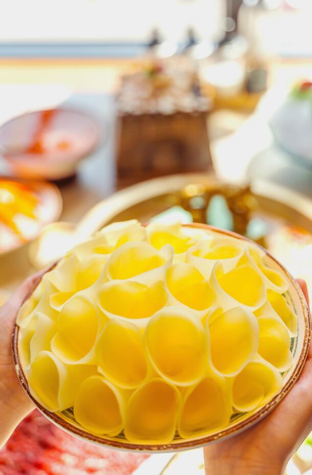 將土豆切成薄片,薄度接近半透明,用水沖去粉質,再將薄如紙片的土豆片卷成花束形狀,一束束插入碗中,在麻辣鮮香的紅油鍋底里燙8秒,土豆卷舒展開來,口感格外爽脆。